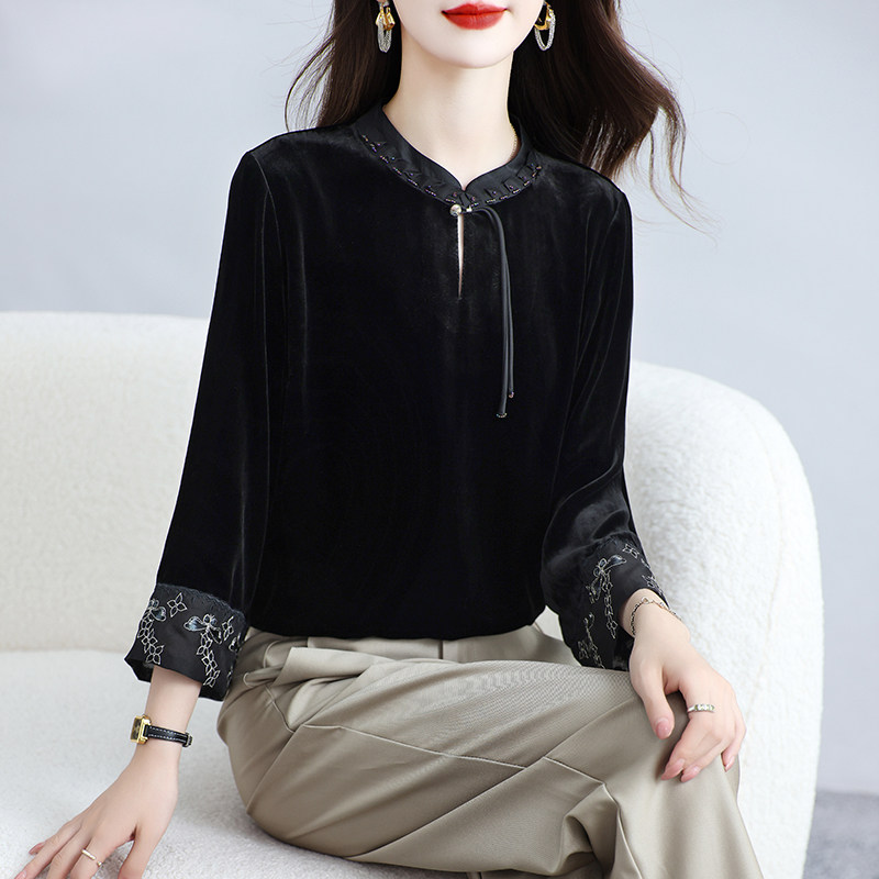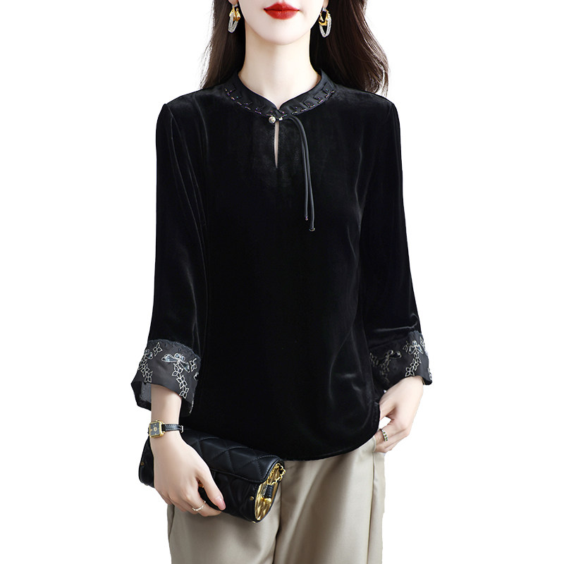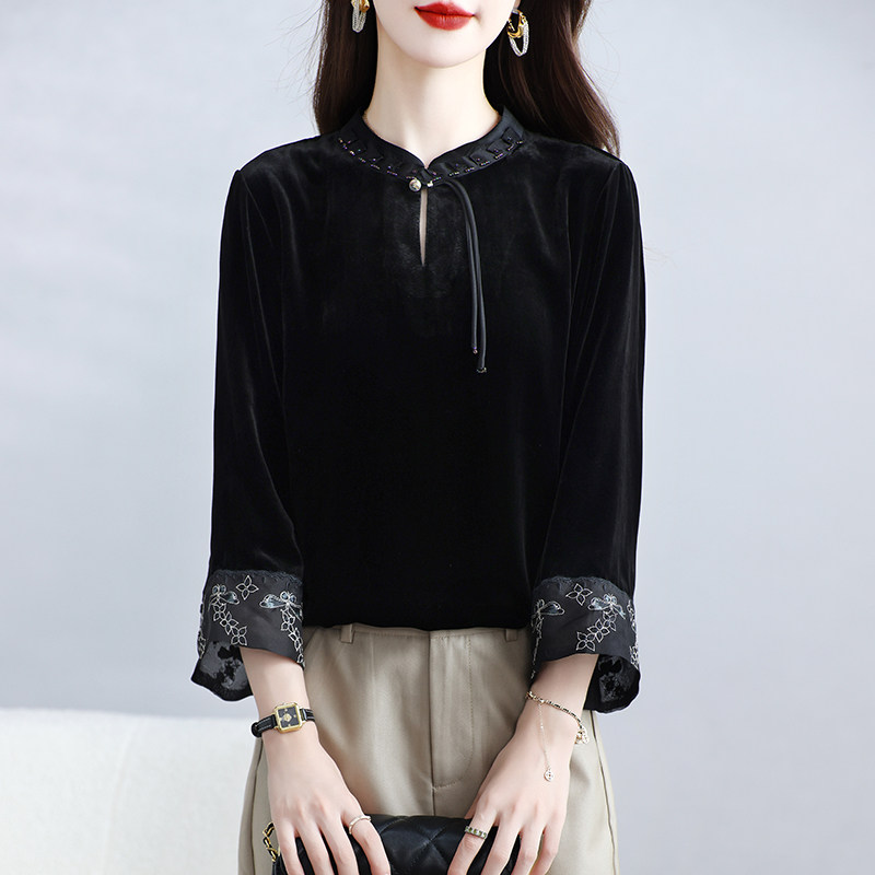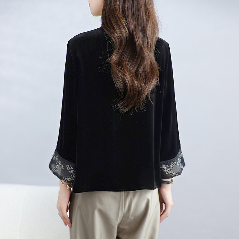 📚 国风真丝丝绒上衣女桑蚕丝七分袖T恤新中式复古显瘦刺绣外套春秋