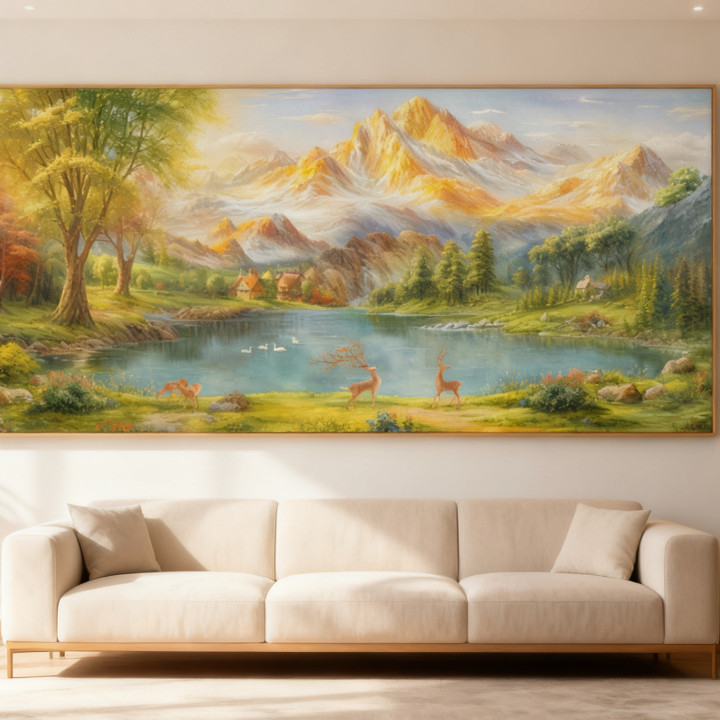 📚 金山聚宝盆欧式山水风景装饰画金山麋鹿客厅背景墙油画高清素材图