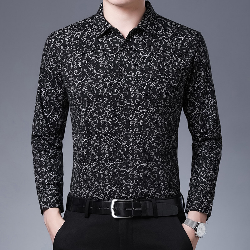 📚 春秋长袖花衬衫j中年男士冰丝免烫花衬衣中老年爸爸装大码印花潮