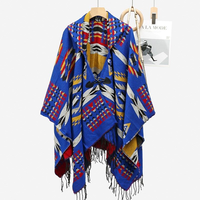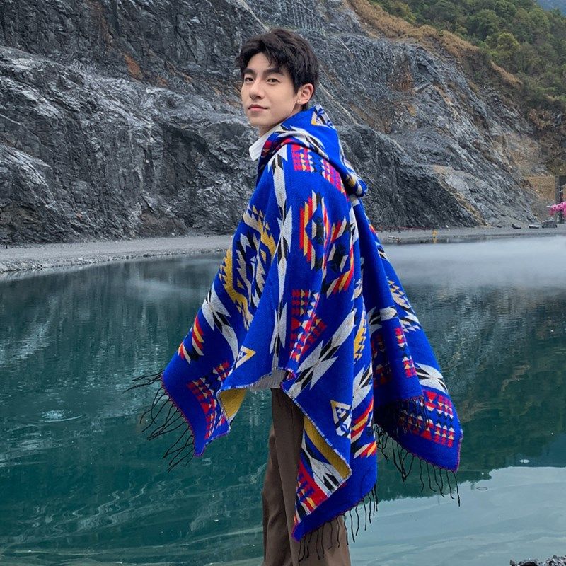 📚 民族风大披肩男宝蓝色外搭披w风斗篷带帽围巾云南丽江新疆旅游拍